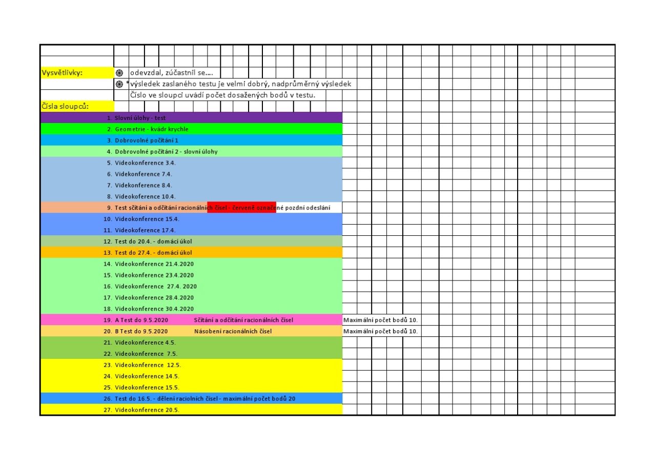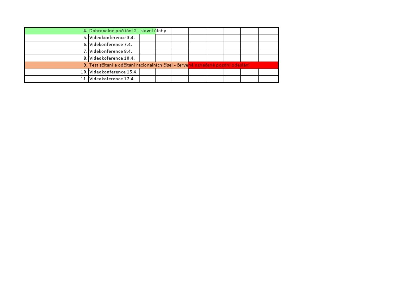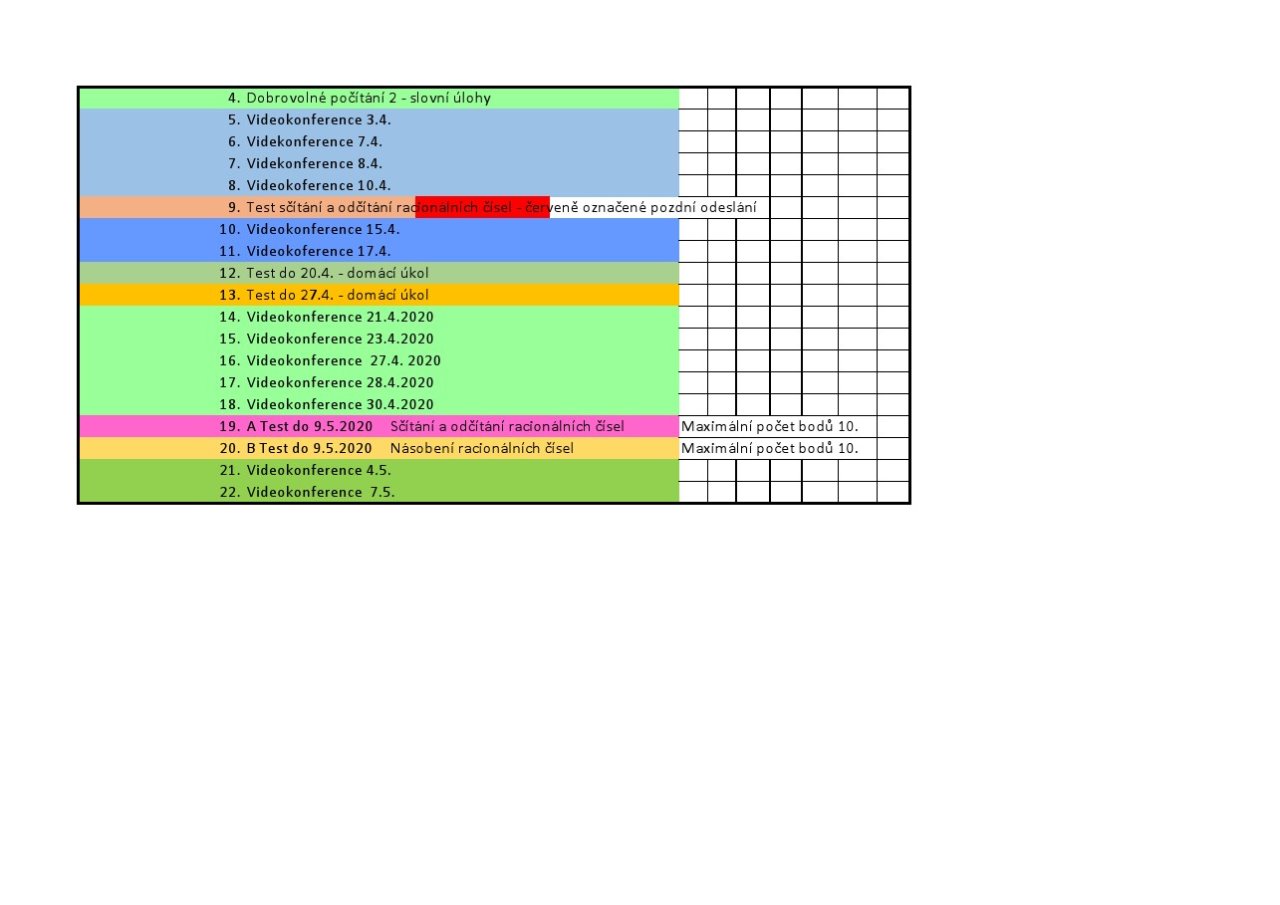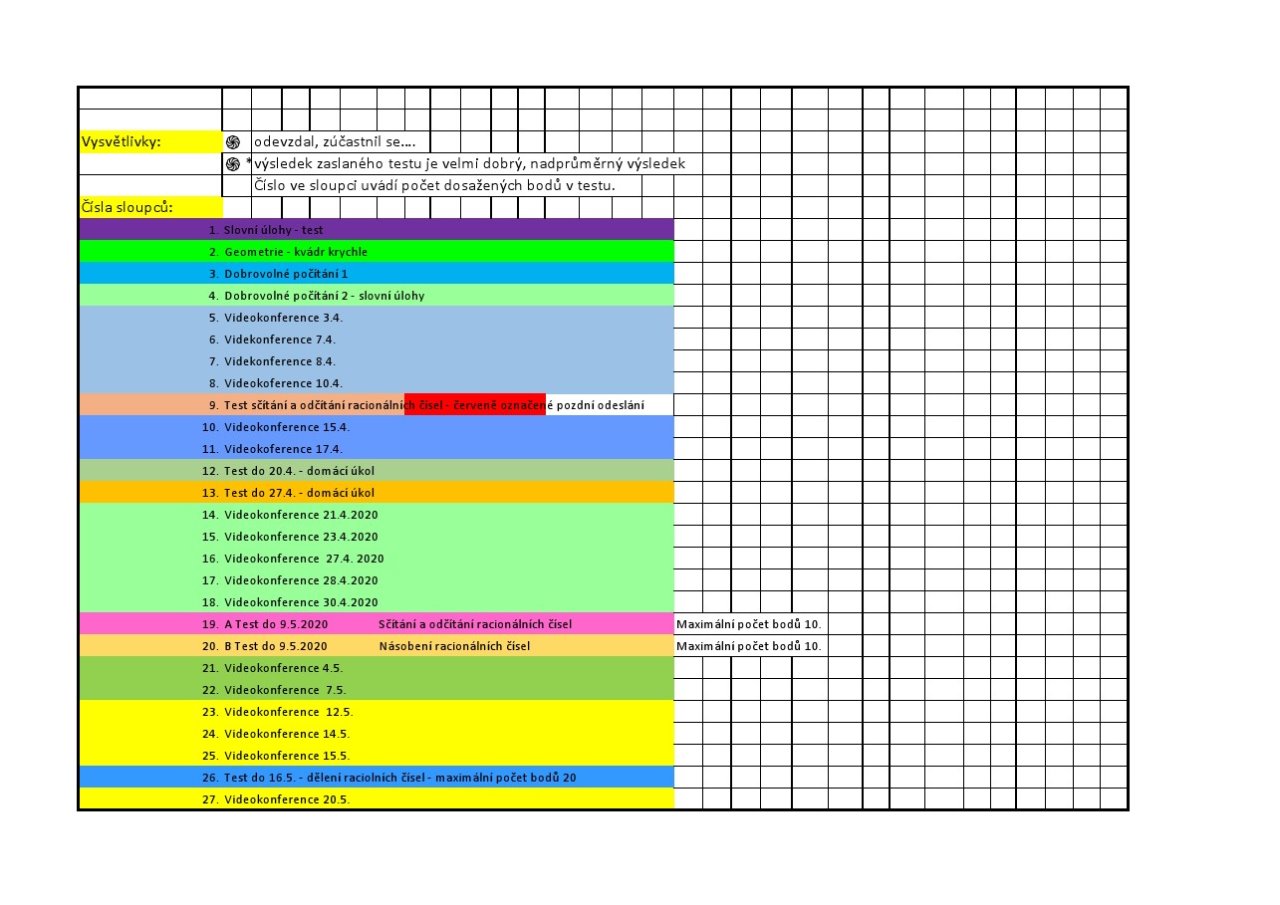 Níže je tabulka s přehledem všech splněných úkolů. Začíná poslední měsíc školního roku a v jeho průběhu se budou uzavírat známky pro vysvědčení. Nějaké známky už máme ze začátku tohoto pololetí a samozřejmě budu přihlížet k tomu, jak jsme pracovali na zadaných úkolech v době uzavření školy. Nebudou mě příliš zajímat chyby v zaslaných testech. Těch se může dopustit každý. Důležitější bude to, jak pravidelně jsem úkoly dostával.
