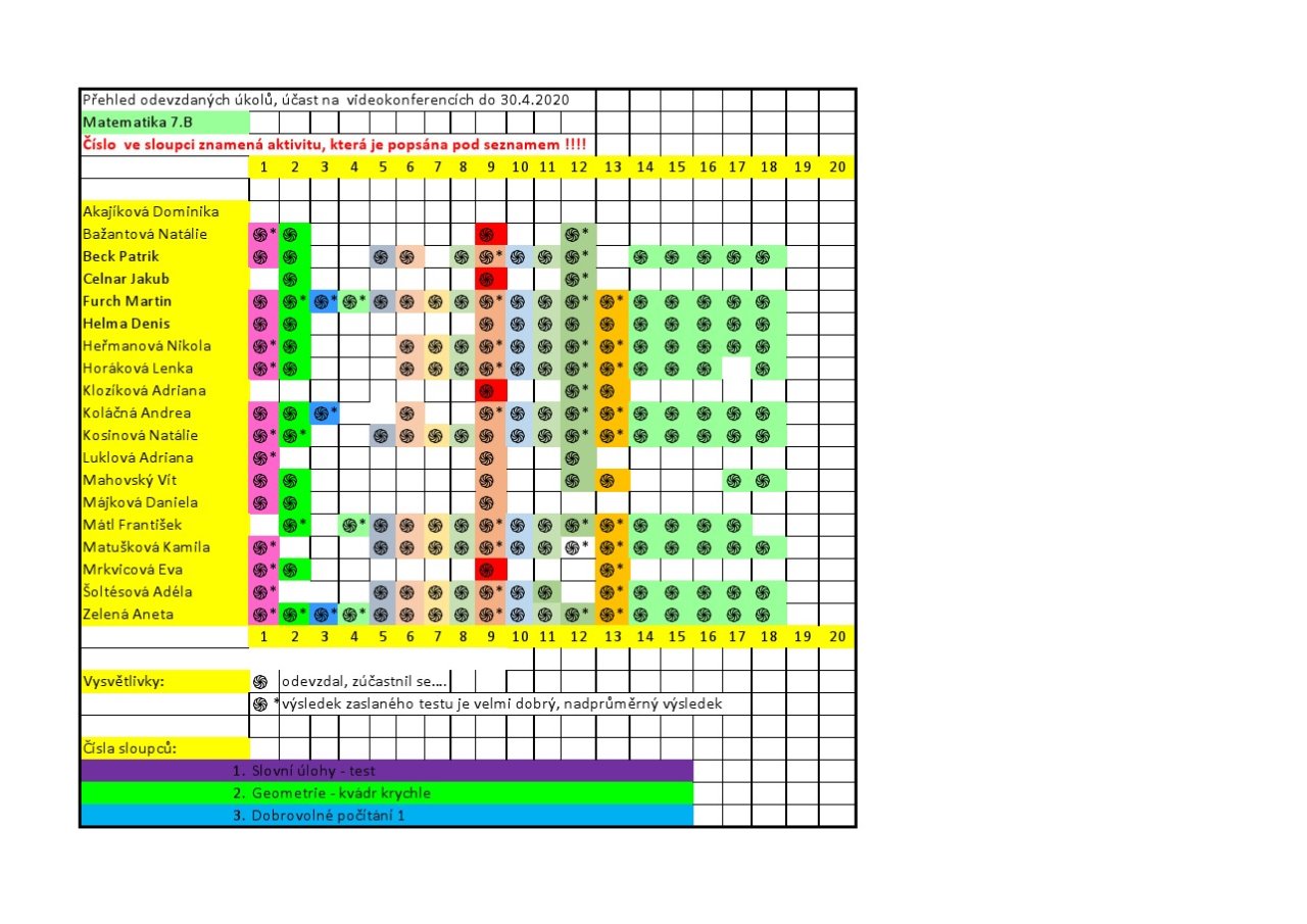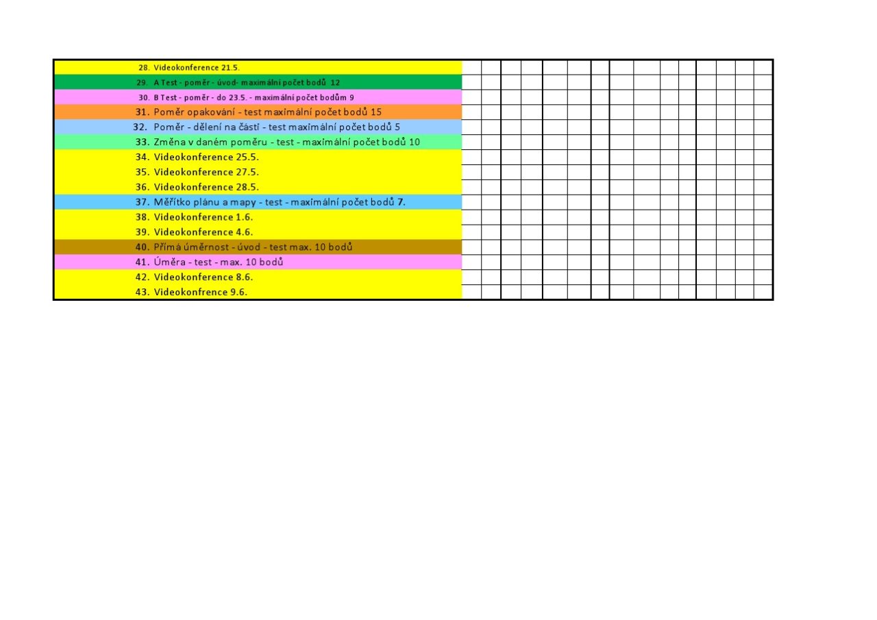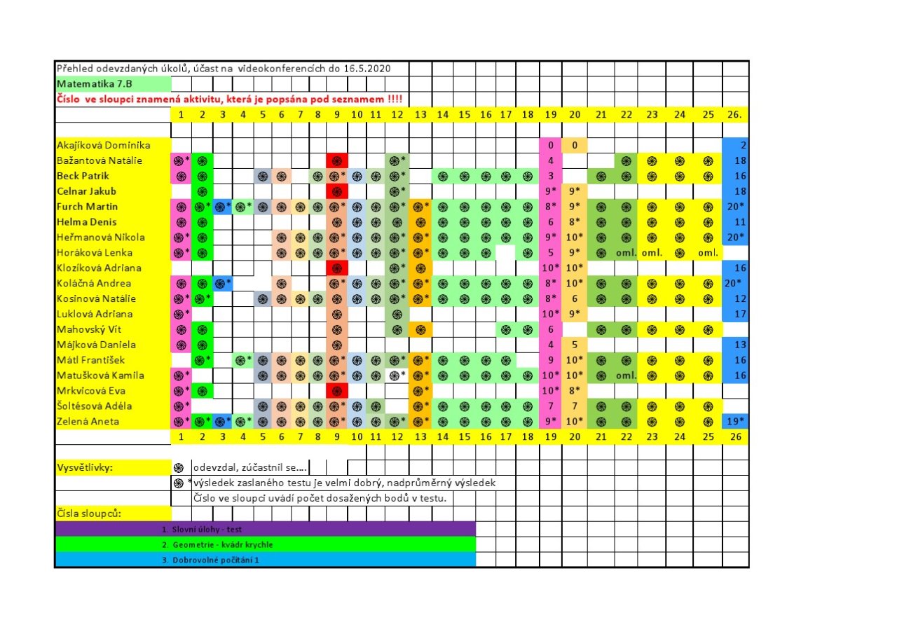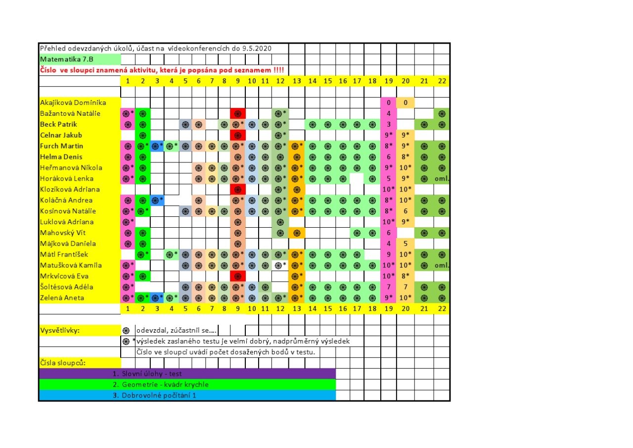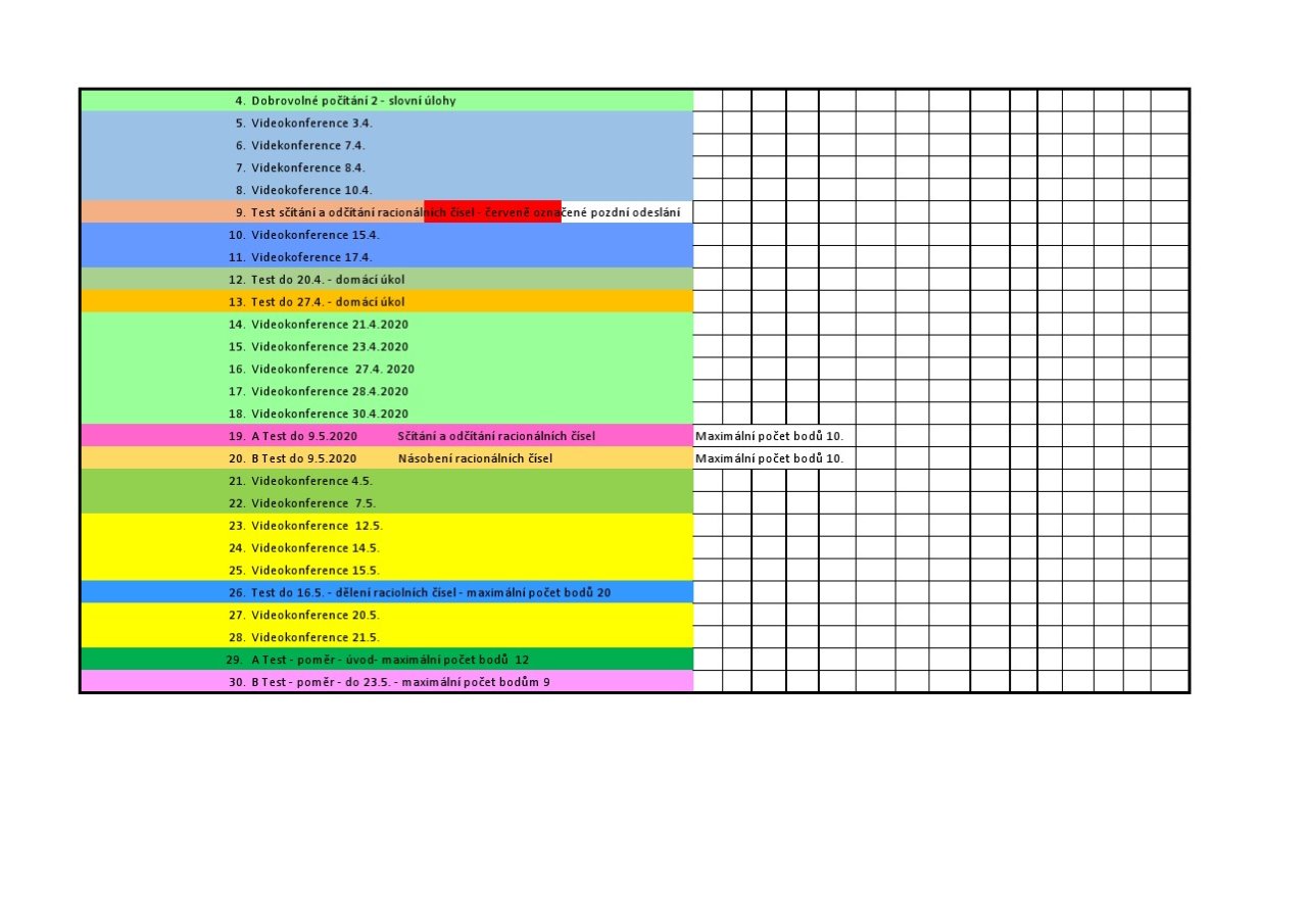 Níže je tabulka s přehledem všech splněných úkolů. Začíná poslední měsíc školního roku a v jeho průběhu se budou uzavírat známky pro vysvědčení. Nějaké známky už máme ze začátku tohoto pololetí a samozřejmě budu přihlížet k tomu, jak jsme pracovali na zadaných úkolech v době uzavření školy. Nebudou mě příliš zajímat chyby v zaslaných testech. Těch se může dopustit každý. Důležitější bude to, jak pravidelně jsem úkoly dostával.