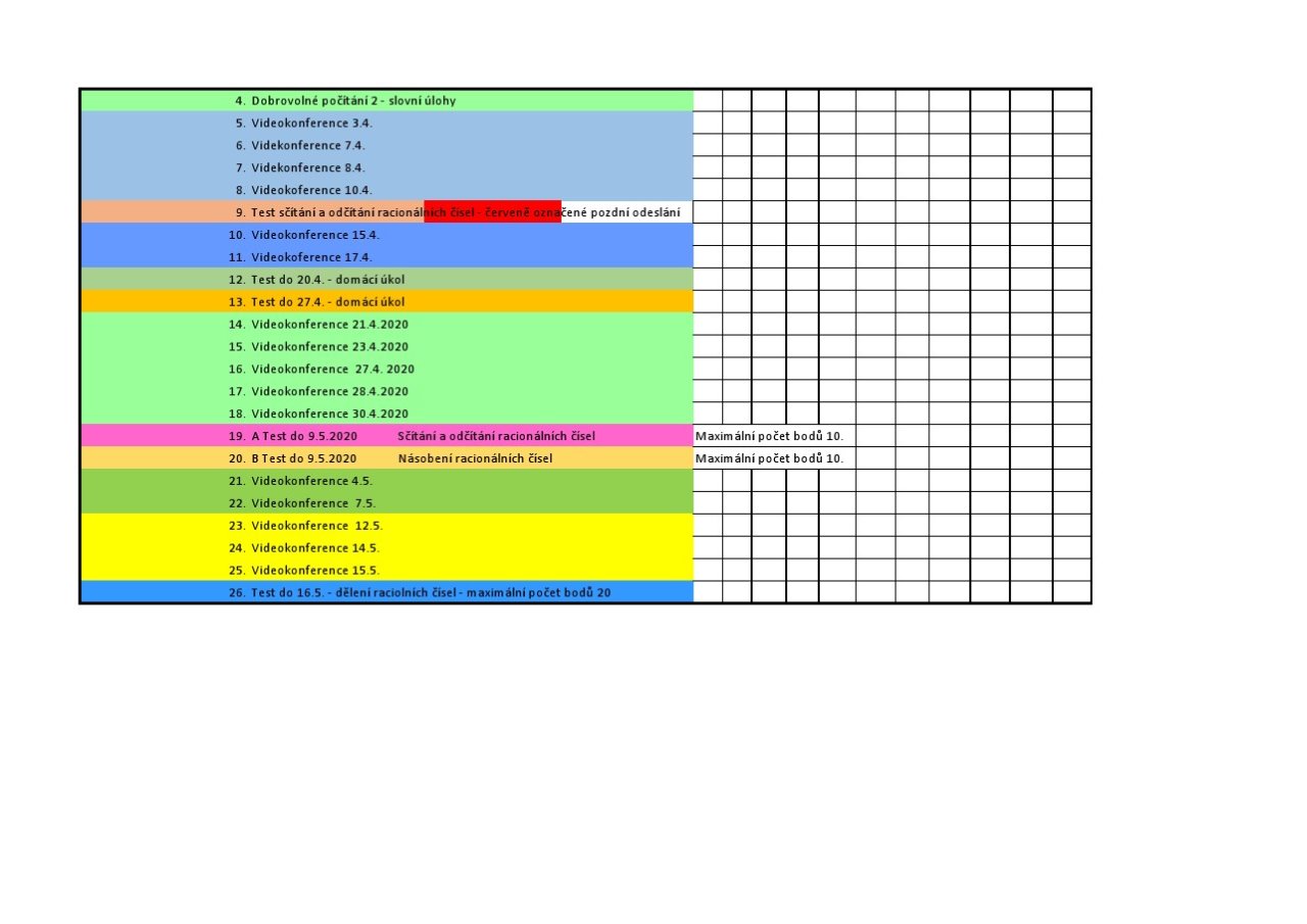 1. Ve videokoferencích jsme výrazně pokročili ve sčítání racionálních čísel. Máme spočítány skoro všechyn příklady na stranách 28 a 29 v pracovním sešitě a začínáme násobení na straně 30 a 31. Tomu se budeme věnovat v týdnu do 9.5.2020.